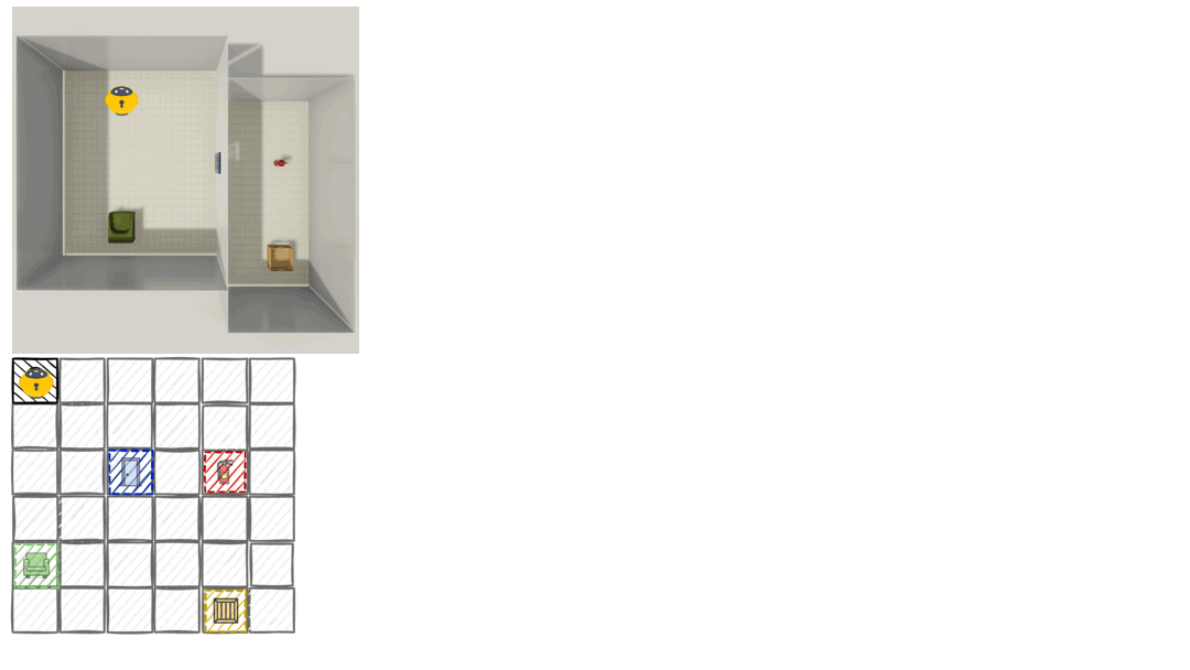 研究人员在程序化生成的多房间室内布局中,提供文本世界(符号化方向/距离)和视觉世界(ThreeDWorld 渲染的第一人称 RGB 图像)两种平行环境。智能体必须自主决定移动、旋转、观察的策略,高效构建空间信念。直觉上你可能会以为这类任务就是「多看看」。但更关键的是,智能体需要用不确定性来驱动行动,去做高效的信息获取。