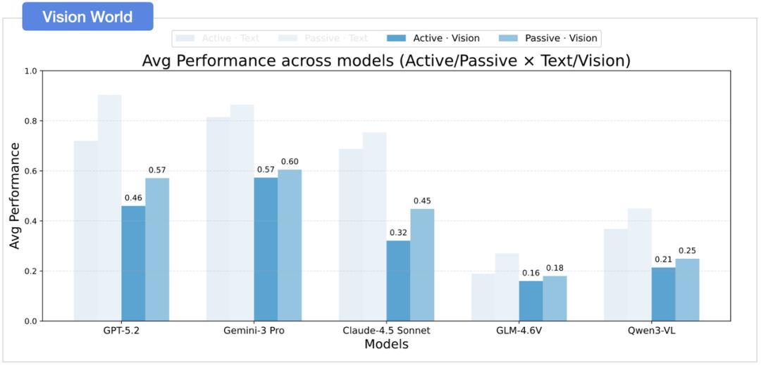 被动模式与主动探索下,视觉与文本都存在巨大性能落差