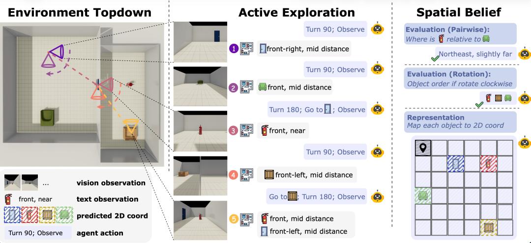 Theory of Space:主动探索、信念探测和任务评估。左侧用俯视图展示智能体在多房间局部观测条件下的行动轨迹;中间展示其在文本或视觉环境中通过「移动—转向—观察」的循环,并根据第一人称观测持续更新内部信念;右侧通过空间任务与认知地图探针,评估这些信念的表征及其使用方式。