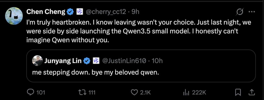 千问团队成员 Chen Cheng 的跟帖林俊旸,暗示此次变动可能非个人自愿。