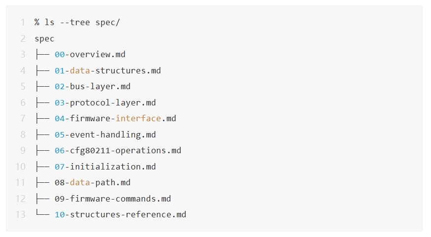 我明确要求:这份规范的目标读者是 clean-room 实现环境中的工程师,需要讲到“bit 级别”且结构清晰。我简单定了一下文档结构,就让 AI 疯狂输出。几轮下来,AI 直接给我整了一本11 章的驱动说明书: