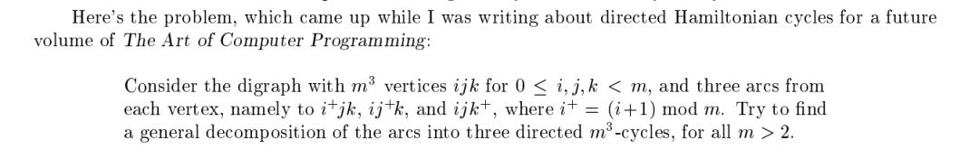 他在书里准备了一道关于有向哈密顿循环的题,和朋友们证明了这道题的特殊解,想把它推广到一般情况时,却解决不了了。