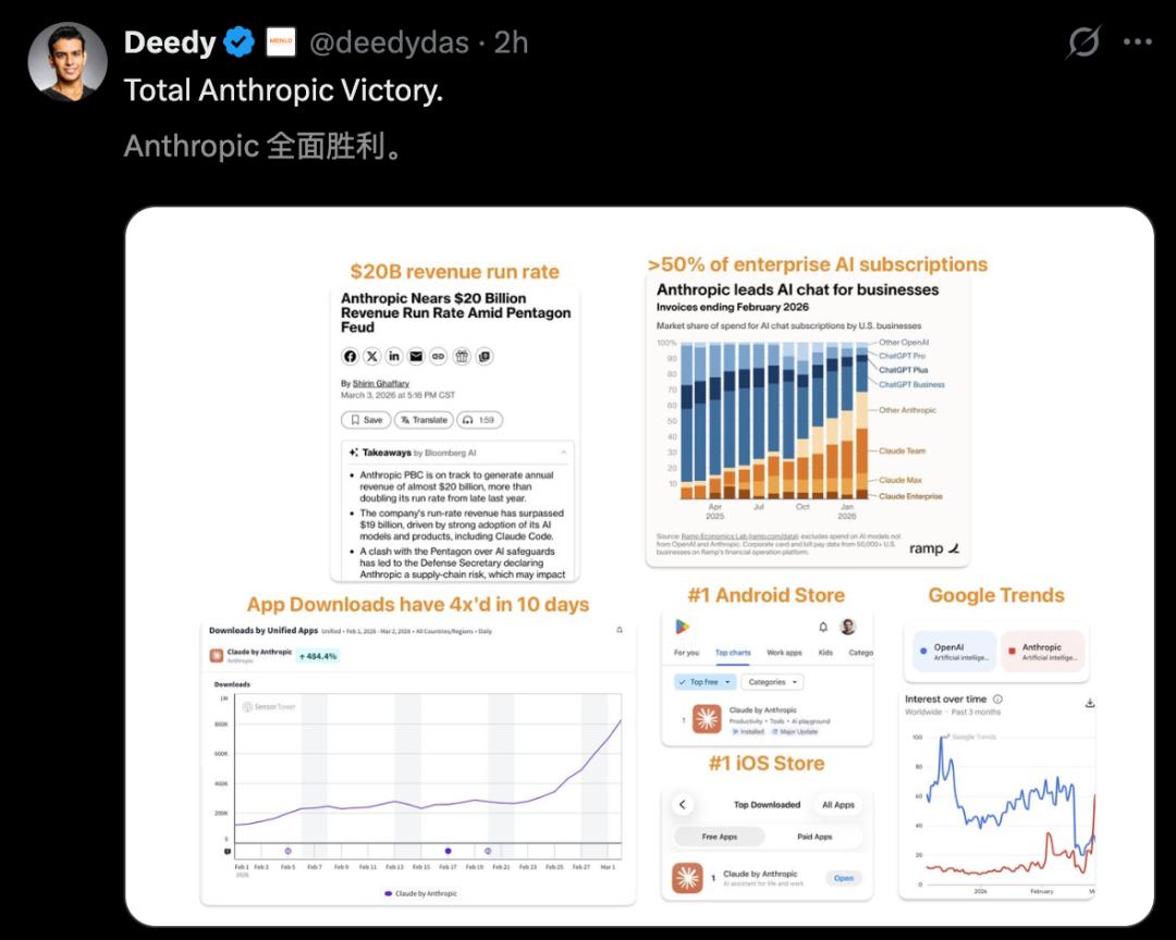 正如网友Deedy所言,Anthropic正取得「全面的胜利」。
