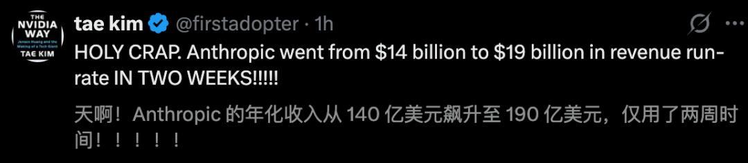 更劲爆的是,Anthropic年化收入(ARR)再次刷爆纪录,接近200亿美元。