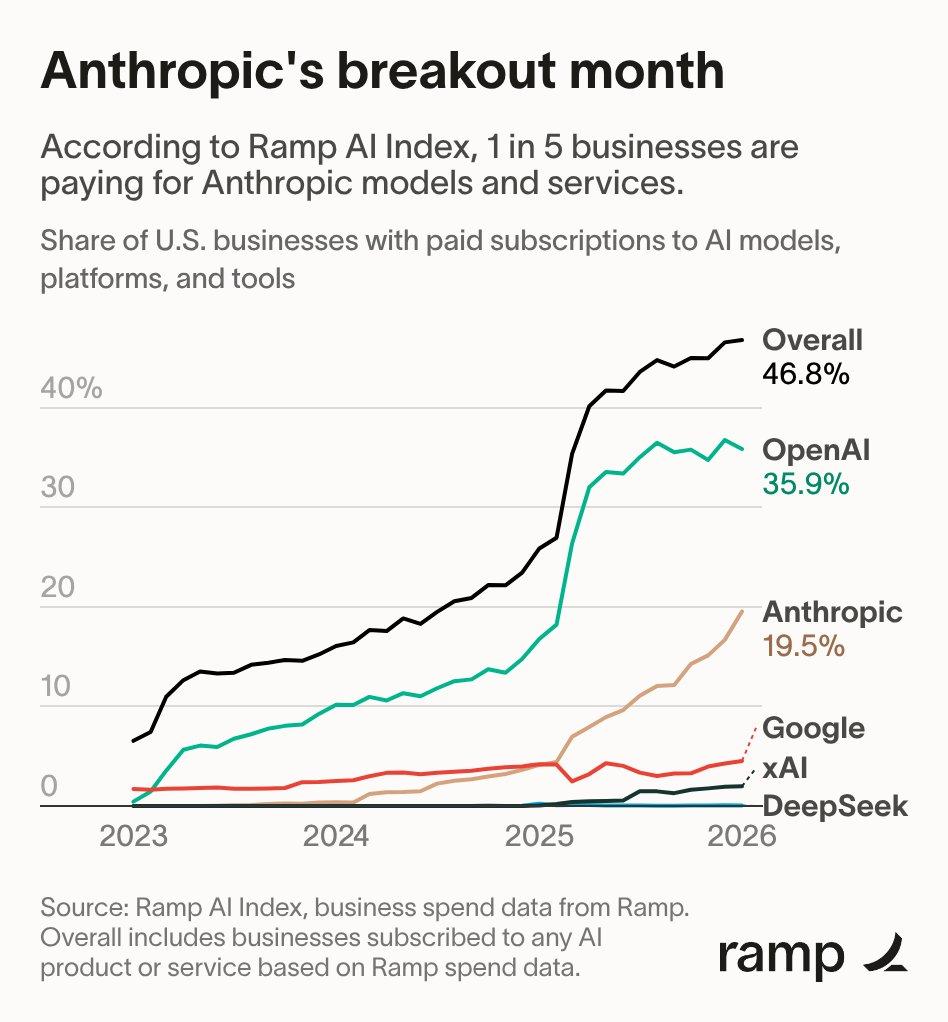 最新的Ramp AI指数显示,Anthropic企业覆盖率从16.7%飙升至19.5%,而OpenAI则下滑至35.9%。