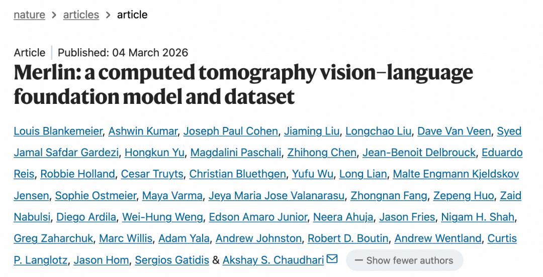今天,来自斯坦福大学的研究团队在 Nature 期刊上发表了一项重磅成果:一个名为 Merlin 的 3D 视觉-语言模型(VLM),不仅能原生处理 3D 体积数据,更在无需额外人工标注的情况下,展现出超越传统模型的惊人临床能力,为医学影像分析带来了全新的范式。