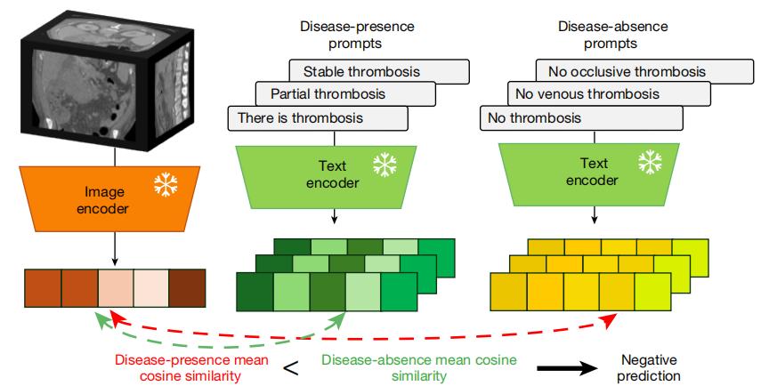 图 | 零样本分类的实现过程,通过将疾病存在提示和疾病不存在提示的文本嵌入与图像嵌入进行对比。