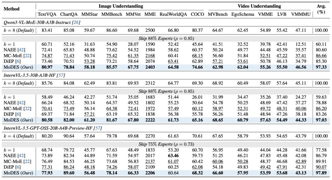 在Qwen3-VL-MoE-30B上,MoDES在跳过88%专家的情况下,仍保留97.33%原始性能,同时带来显著推理加速,打破了一个长期存在的共识:高比例专家跳过必然带来不可接受的性能损失。