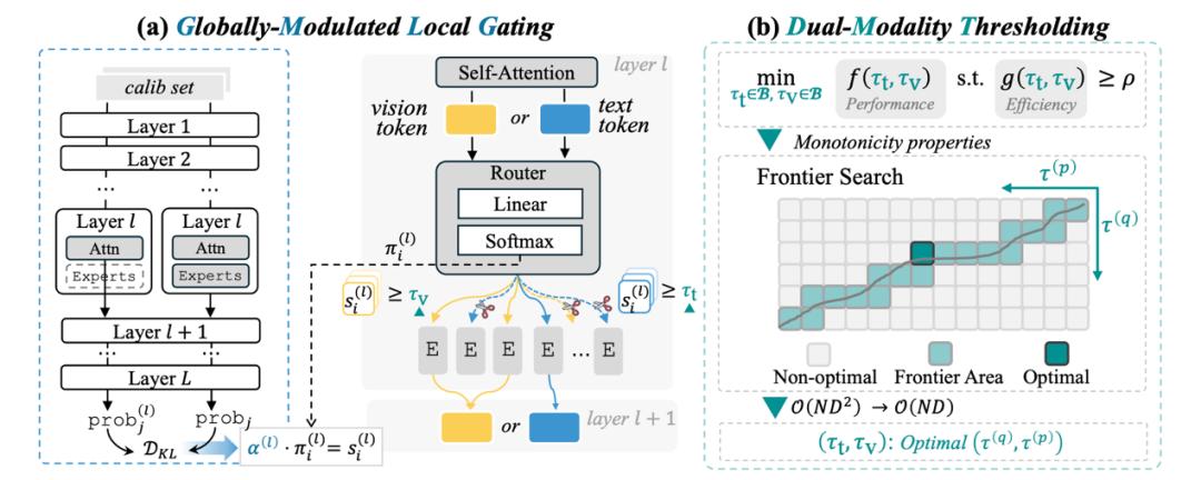 其次,MoDES引入双模态阈值机制,为文本token与视觉token分别设定不同的skipping阈值。通过模态区分,使专家跳过决策更加精细化,避免误删关键专家。