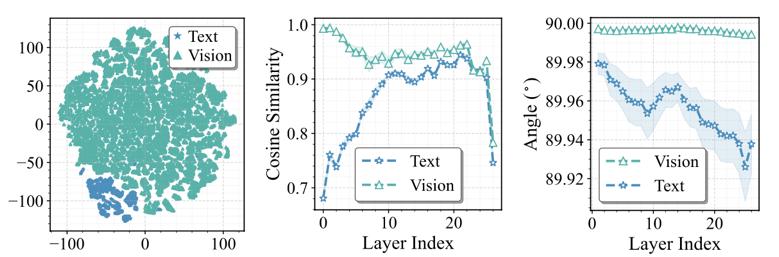 文本token与视觉token行为存在显著差异:论文进一步分析了模态差异。通过对FFN前后token表征的可视化与统计分析,研究者发现:文本token在FFN中的更新幅度明显更大;视觉token与专家权重更接近正交;专家对视觉token的影响相对较小。