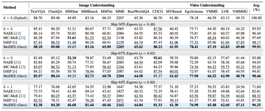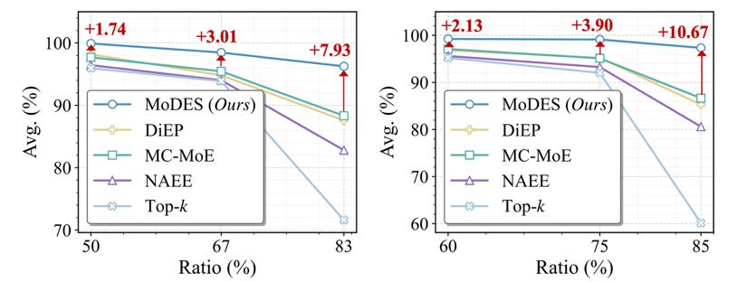 通过显式建模不同层专家对最终输出分布的全局贡献,以及不同模态token在专家网络中的更新特性,MoDES证明了一件重要的事情:即便跳过80%以上的专家,只要跳得足够「聪明」,模型性能依然可以稳定保持。
