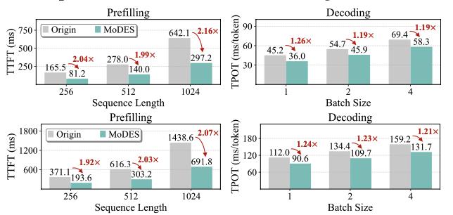 在实际推理测试中,MoDES在H200 GPU上实现了显著加速。在Prefill阶段获得约2×加速,在Decoding阶段仍有约1.2×提升(见图表 8)。由于MoDES为training-free方法,推理阶段不引入额外计算开销,因此加速效果更加稳定。
