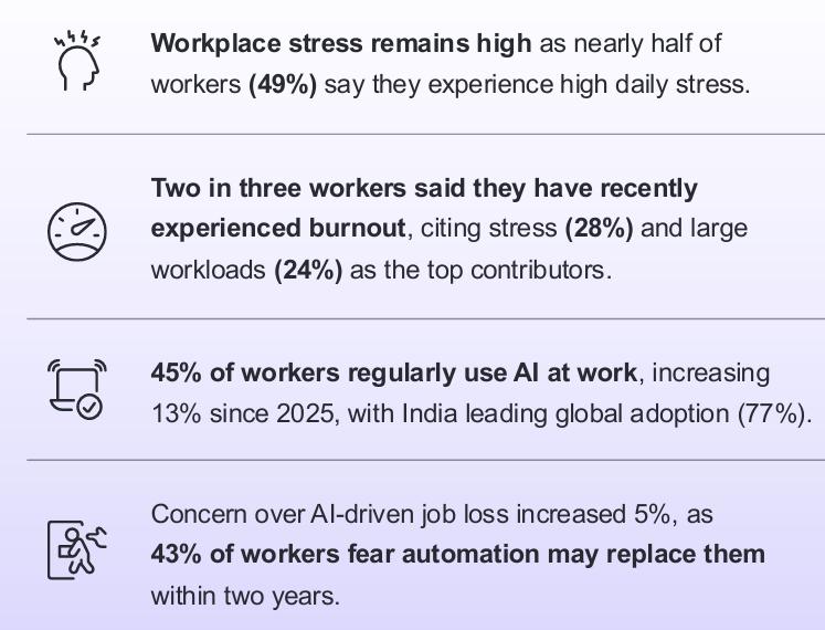 Manpower Group最新发布的《2026全球人才晴雨表》显示,过去一年里,定期使用AI的打工人比例飙升了13个百分点,达到45%。