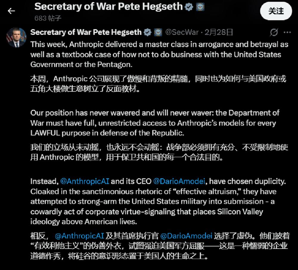 Anthropic的管理层告诉美国国防部,这已经越界了,最终交易告吹。随后,在上周五,美国总统特朗普在社交媒体上宣布封杀Anthropic,美国国防部长Pete Hegseth也于发文称Anthropic构成供应链风险——这种认定通常只会用于美国的对手国家或实体。