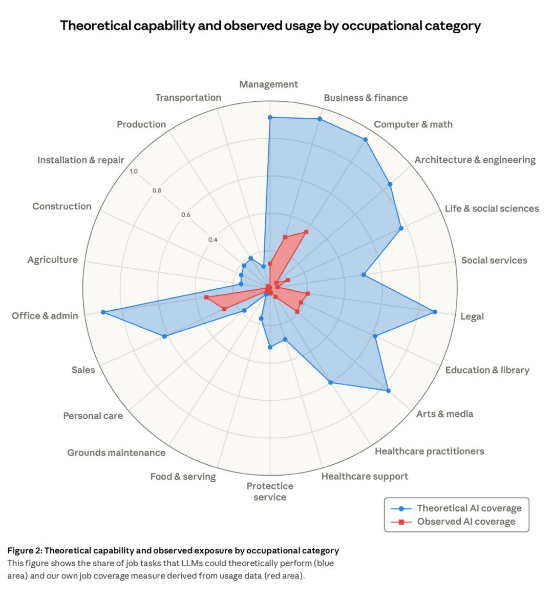 数据来自三个地方,包括O*NET职业数据库(美国约800个职业的具体任务),Claude的真实使用数据以及大模型的理论能力研究。