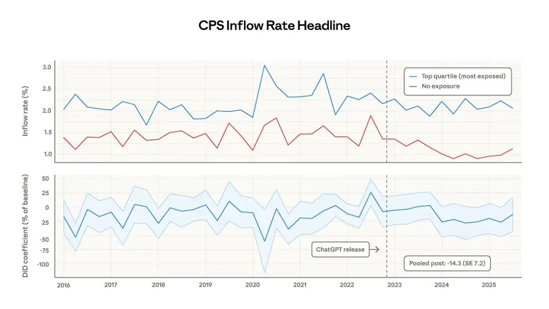 可另一个信号更危险:22-25岁的年轻人,在高暴露岗位的入职率直接掉了14%。老员工还能靠经验苟住,新人连门都摸不到了。