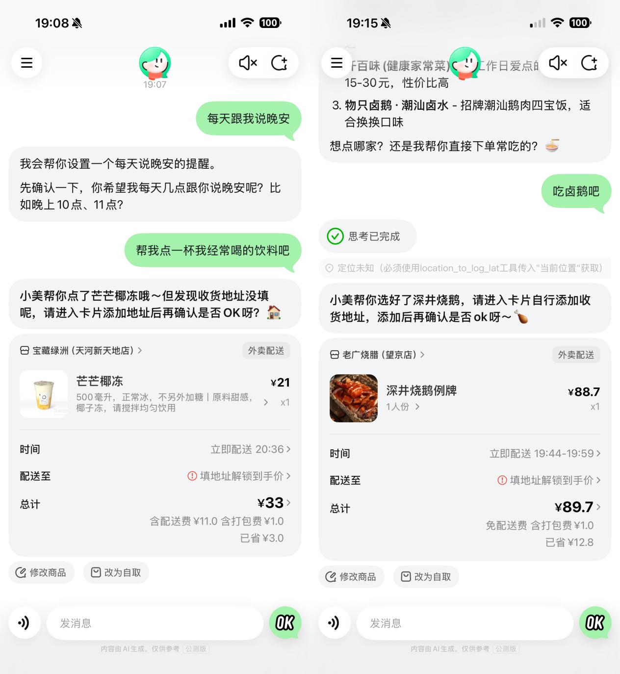 实测显示,“小美”已经具备相当成熟的场景理解能力。比如我说“帮我点一杯经常喝的饮料”“晚饭不知道吃什么好”,系统能直接调出历史偏好生成订单,然后直接帮我推荐。这种端到端能力,必然离不开美团深耕本地生活十余年积累的数据经验。