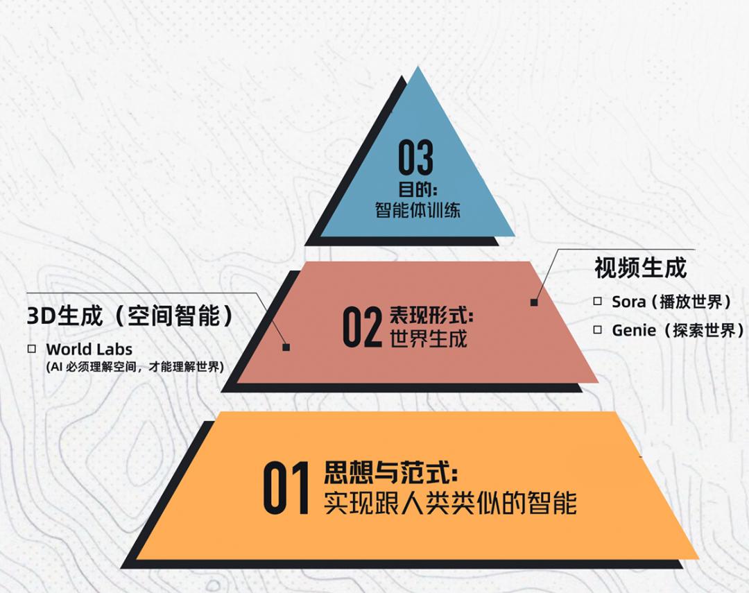 所以视频生成虽然是目前最直观、最能应用落地的一步,但它目前也只是画出了世界的一层皮,但还缺少有血有肉的框架。那如何才能勾勒出世界表层下的框架呢?