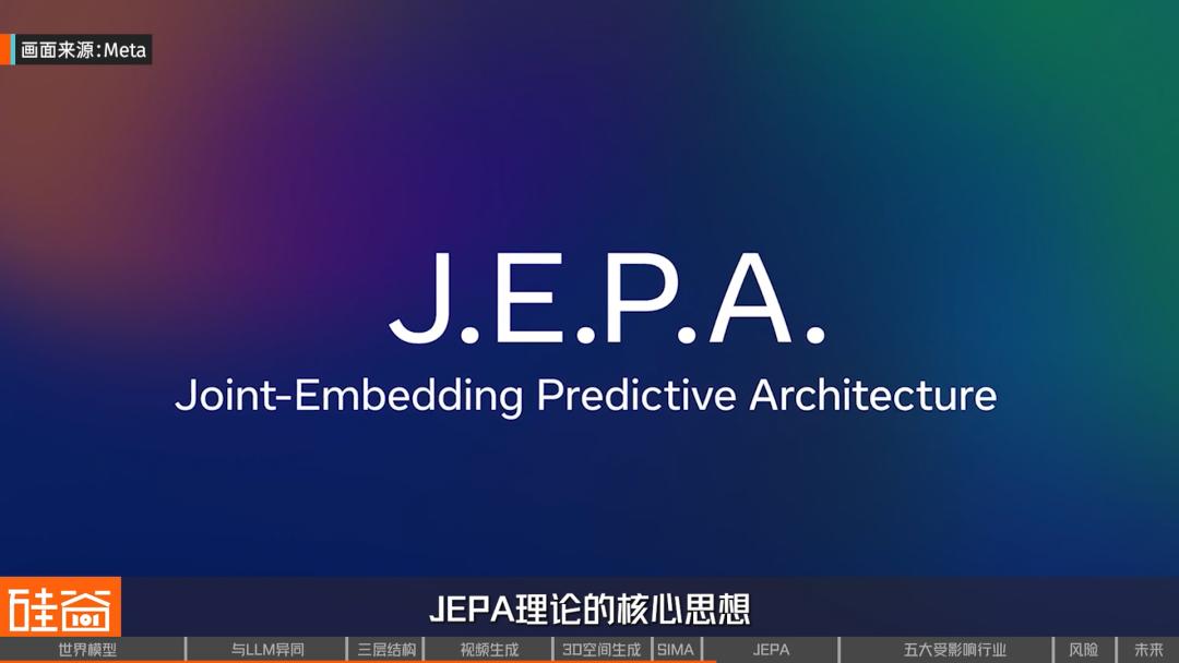 理解世界的结构,比生成世界的外观更重要。这正是Yann LeCun所提出的JEPA(Joint Embedding Predictive Architecture,联合嵌入预测架构)理论的核心思想。JEPA不预测图像、不预测像素,也不重建视觉内容,它做的事情是把真实世界压缩成一个抽象的、高维的潜在表示,然后在这个潜在空间里进行预测。预测的目标可以是空间上被遮挡的区域,也可以是时间上的后续状态。
