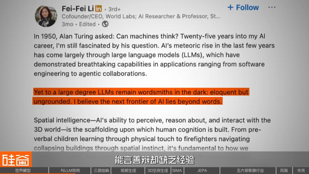 李飞飞最近也在密集地发声,她说大语言模型仍然是黑暗中的文字匠人:能言善辩,却缺乏经验;知识渊博,却脱离现实。