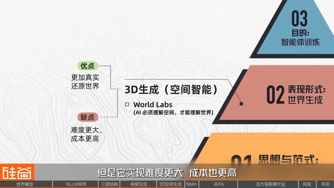 总结来说,3D生成路线能够更加真实地去还原世界,但它实现难度更大、成本更高。