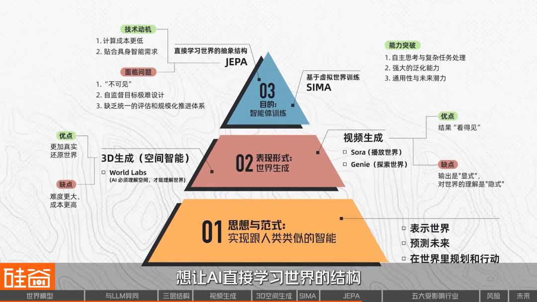 到这里,我们把世界模型最核心的几条技术路线都梳理了一遍:有人用视频把世界“画”出来;有人用 3D 把世界“搭”出来;有人在虚拟世界里训练行动智能;也有人干脆不画世界,想让AI直接学习世界的结构。