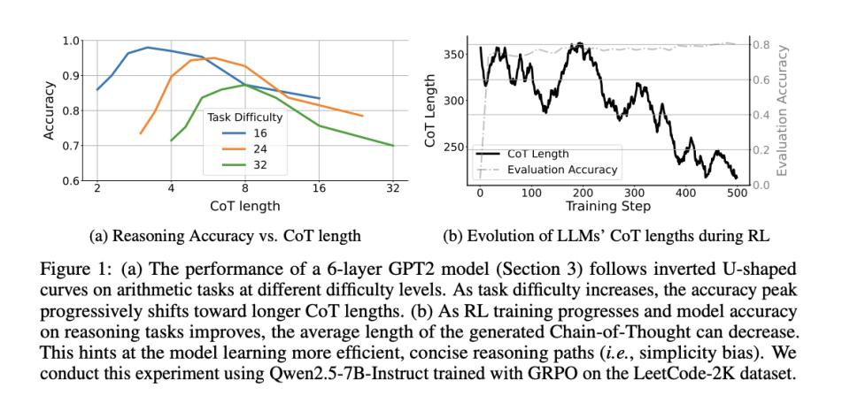 2025年5月,一篇题为《When More is Less》的论文为这个现象提供了更精确的刻画。用控制实验构造了不同长度的推理链,并在多个难度梯度的任务上绘制出长度-准确率曲线。他们发现,思维链的长度与最终结果的准确率之间其实是一个倒U型曲线。