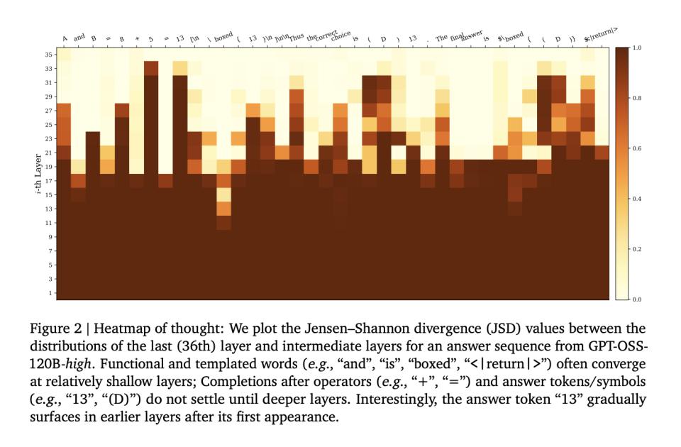 但对于那些真正需要推理的关键tokens,比如算式中的数字、逻辑关系词、或者答案本身,模型的预测会一直修正到很深的层才收敛。