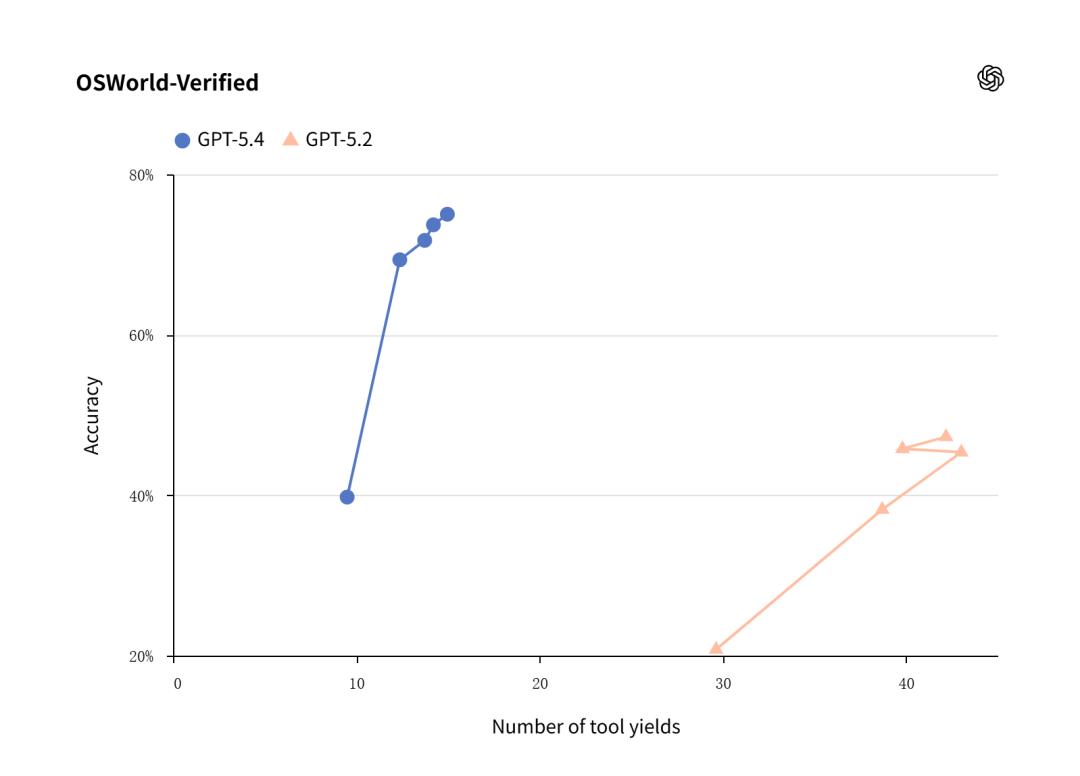 在 OSWorld-Verified 基准测试中,GPT-5.4 实现了 75% 的成功率,超越人类基准(72.4%) 的同时,大幅领先于前代 GPT-5.2 的 47.3% 水平,足以证明新模型在 PC 端任务场景中的实用和可靠 。