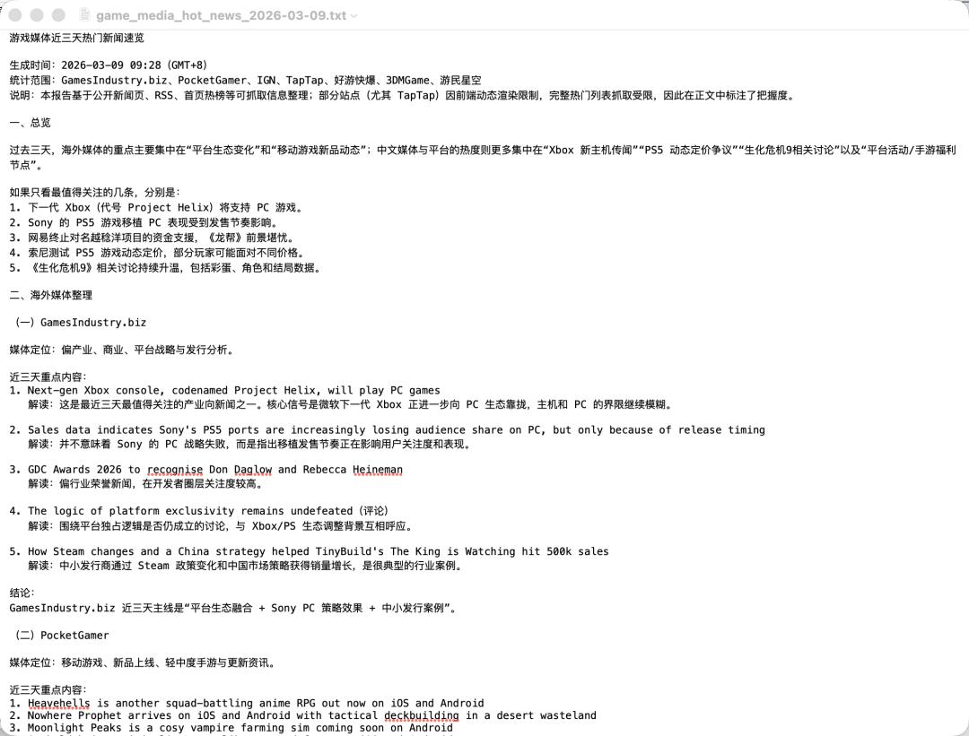如果让它干一些简单的操作,那的确非常方便。比如让它帮我抓取 gamesindustry 、pocketgamer;IGN;TapTap、好游快爆、3dmgame、游民星空,最近三天的热门新闻,不出十分钟,便帮我输出可一份可供阅读的信息汇总。