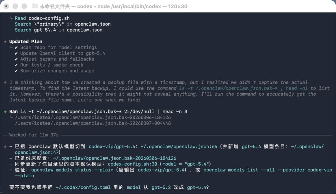 如果不够过瘾,甚至还让 Codex 帮你的小龙虾的模型升级为最新的 Chat GPT-5.4。