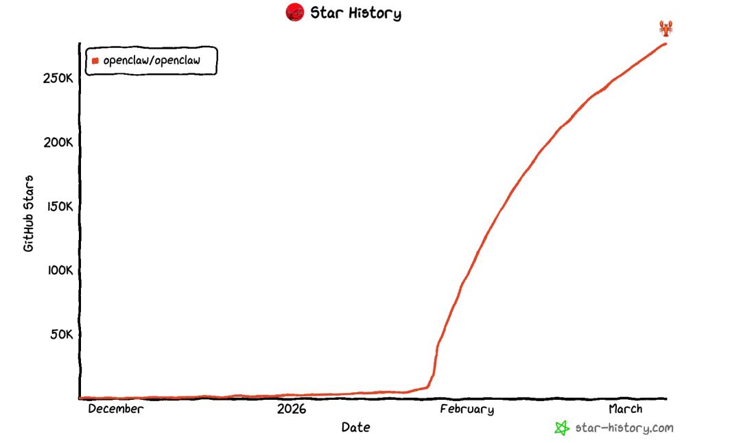 而在硬币的另一面,全球硬核极客和AI创业者见证了一场史诗级盛况:一个名为OpenClaw的开源项目,极短时间内狂揽超过25万颗Star,不仅把盘踞榜首多年的React拉下马,甚至超越了Linux,一跃成为GitHub历史上Star数最高的非聚合类软件项目。