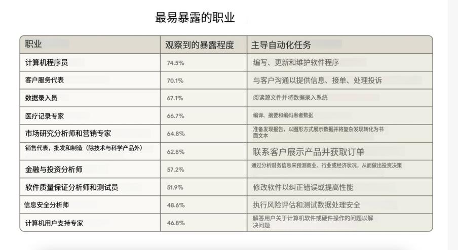 这非常符合直觉。写代码、回客服邮件、录入数据,这些高度结构化、基于文本的任务,恰恰是大模型最擅长的领域。