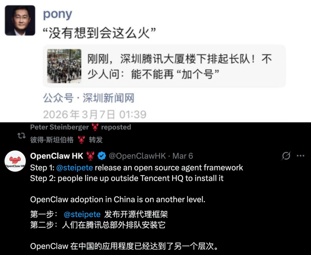 3月6日,腾讯云在深圳腾讯大厦举办OpenClaw免费安装活动,当天OpenClaw创始人Peter Steinberger还转发了相关推文。3月7日凌晨,马化腾在朋友圈转发感慨:“没有想到会这么火。”