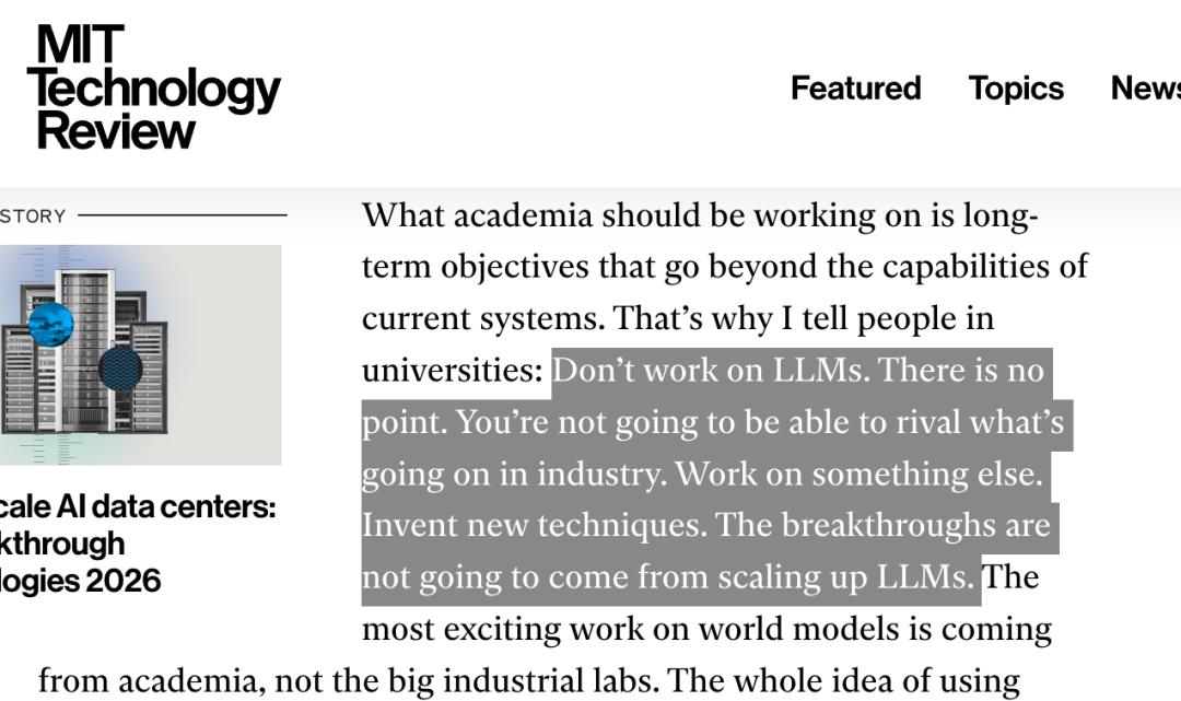 「别做 LLM。没有意义,你们赶不上业界。去发明新技术,去解决当前系统之外的问题。突破不会来自把 LLM 继续做大。」