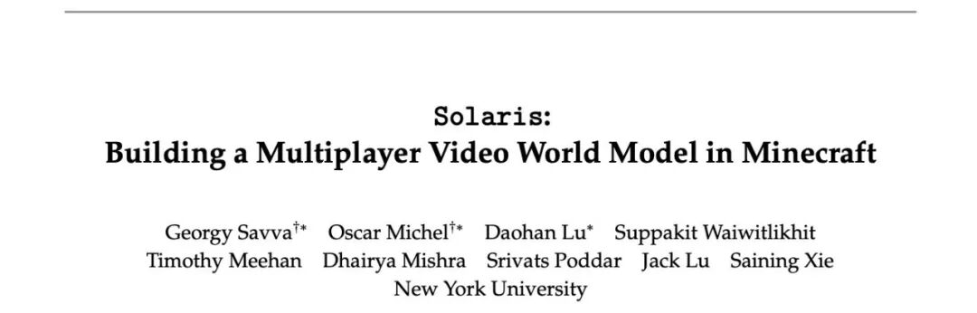 谢赛宁近段时间在纽约大学推进的也是相关方向。他的团队发表的「Solaris」,就是用 Minecraft 构建的多人视频世界模型,用以测试 AI 在动态环境下的预测与规划能力。