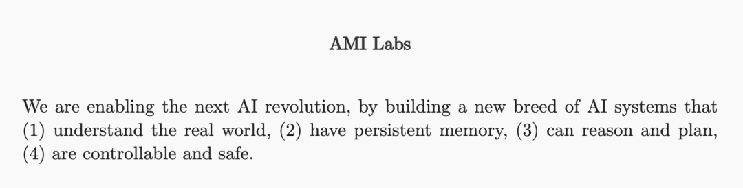 AMI全称 Advanced Machine Intelligence「先进机器智能」,以世界模型 (world models) 为主要研发方向,力求开发出能够从真实世界中学习抽象表征的世界模型。