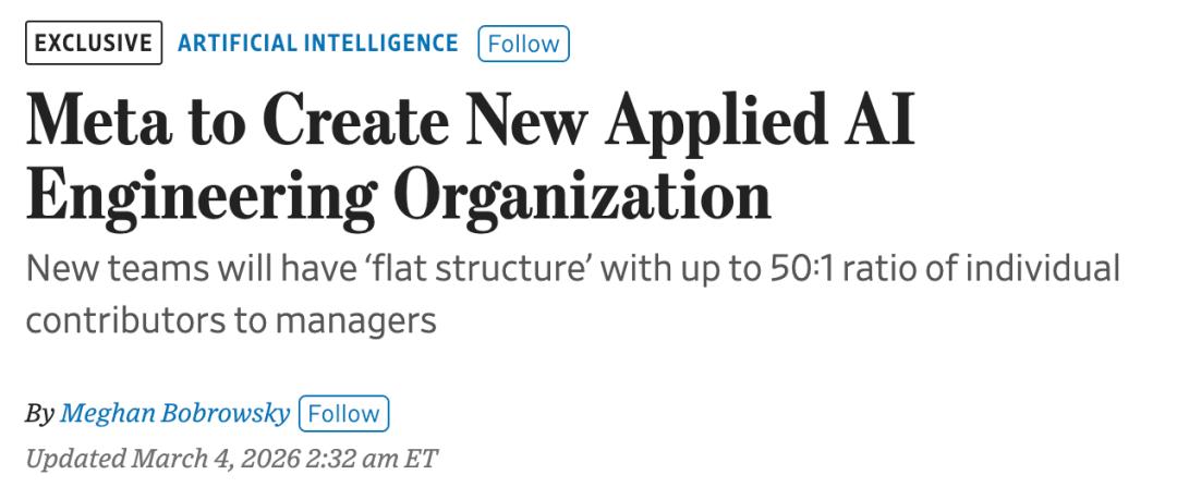 与此同时,Meta正在打造一种「极致扁平」的组织架构,即一线员工(IC)与经理的比例最高可达50:1 。