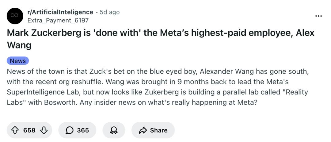 有传扎克伯格对王的“押注”失败,开始重新组织Meta的AI部门的。