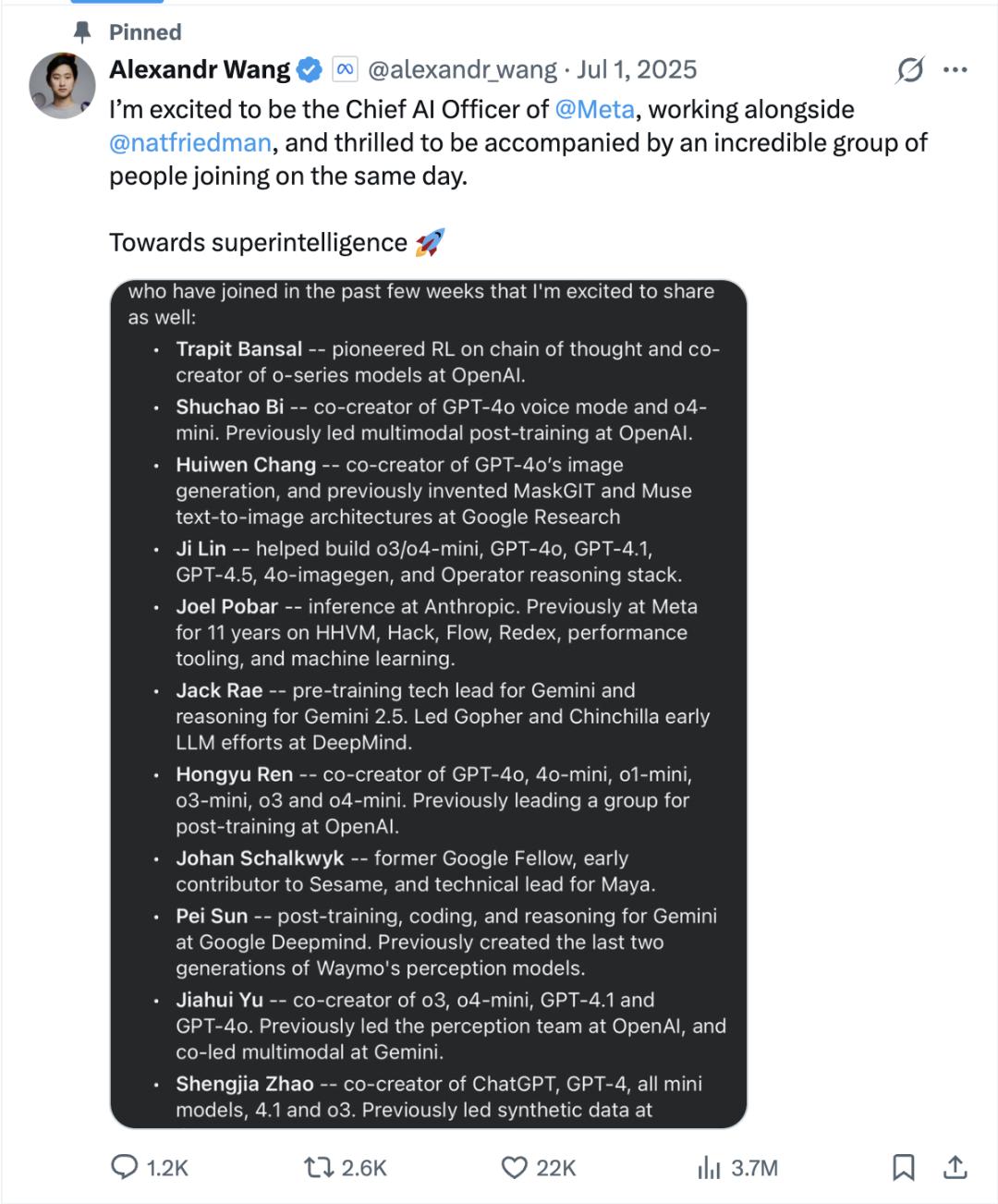 一头是从OpenAI、Anthropic、Google DeepMind挖来一批顶级研究员,包括大名鼎鼎的Cot作者Jason Wei,OpenAI研究员赵晟佳等人。