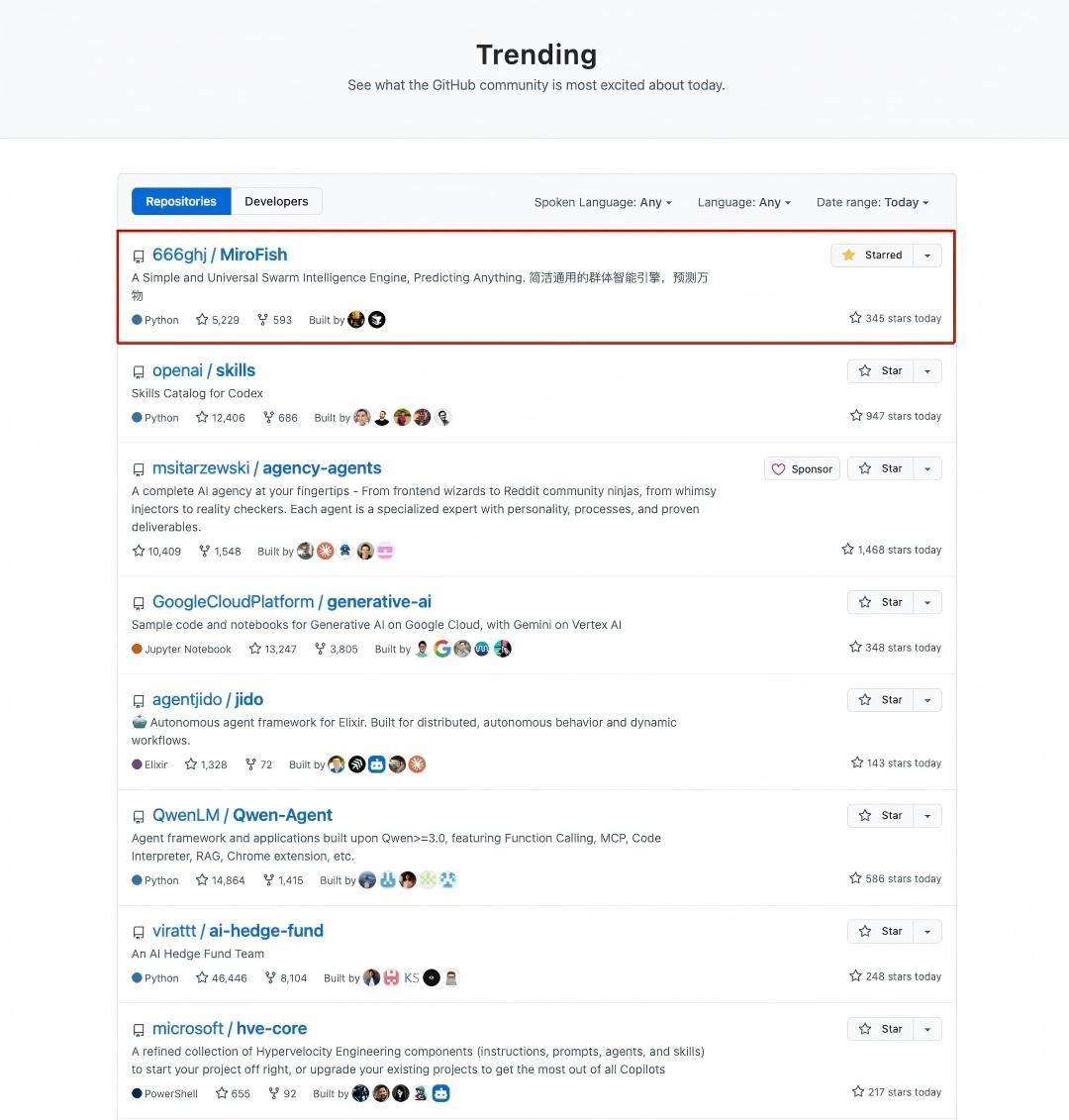凤凰网科技讯 3月10日 中国大四学生郭航江独立开发的群体智能引擎MiroFish近日登顶GitHub全球趋势榜第一。凭借该AI预测引擎项目,郭航江团队已获得盛大集团创始人陈天桥3000万元注资,资金将用于产品的深度孵化。这是该开发者在三个月内第二次登顶该榜单,且两次的开发周期均仅为十天。