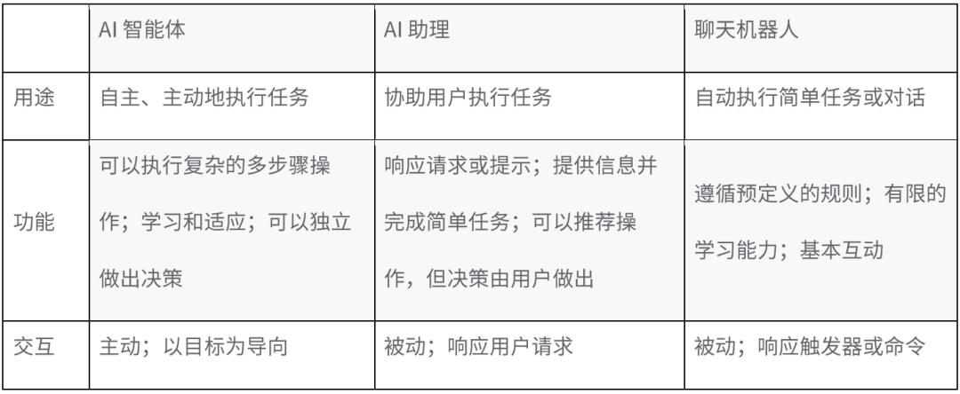 前者译为代理,强调的是动作的自主性;后者有推动者之意,强调的是目标导向。 而在AI 语境下Agent(中文称为智能体)是两种意思兼而有之,它是能够自主感知环境、进行决策并采取行动以实现特定目标的智能系统。它与AI助理和ChatBot之间的区别如下表所示: