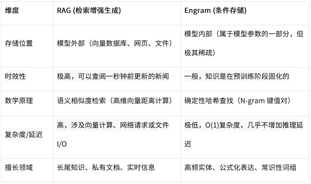 某种程度上来说,Engram有点像RAG,它一定程度上是RAG的内化,但它们也有显著的不同,如下表所列。 两者相辅相成,不能取代彼此。