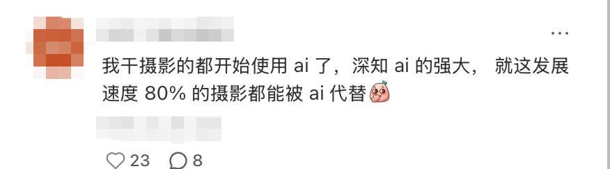 一位资深从业者坦白:“我干摄影的都开始使用AI了,深知AI的强大。就这发展速度,80%的摄影都能被AI代替。”