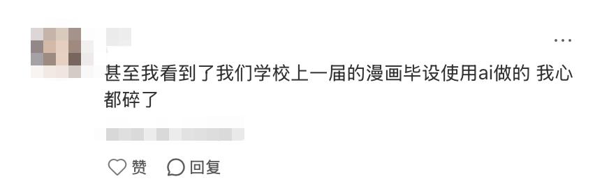 一位美术生留下了一句充满无力感的评论:“甚至我看到了我们学校上一届的漫画毕设是使用AI做的,我心都碎了。”