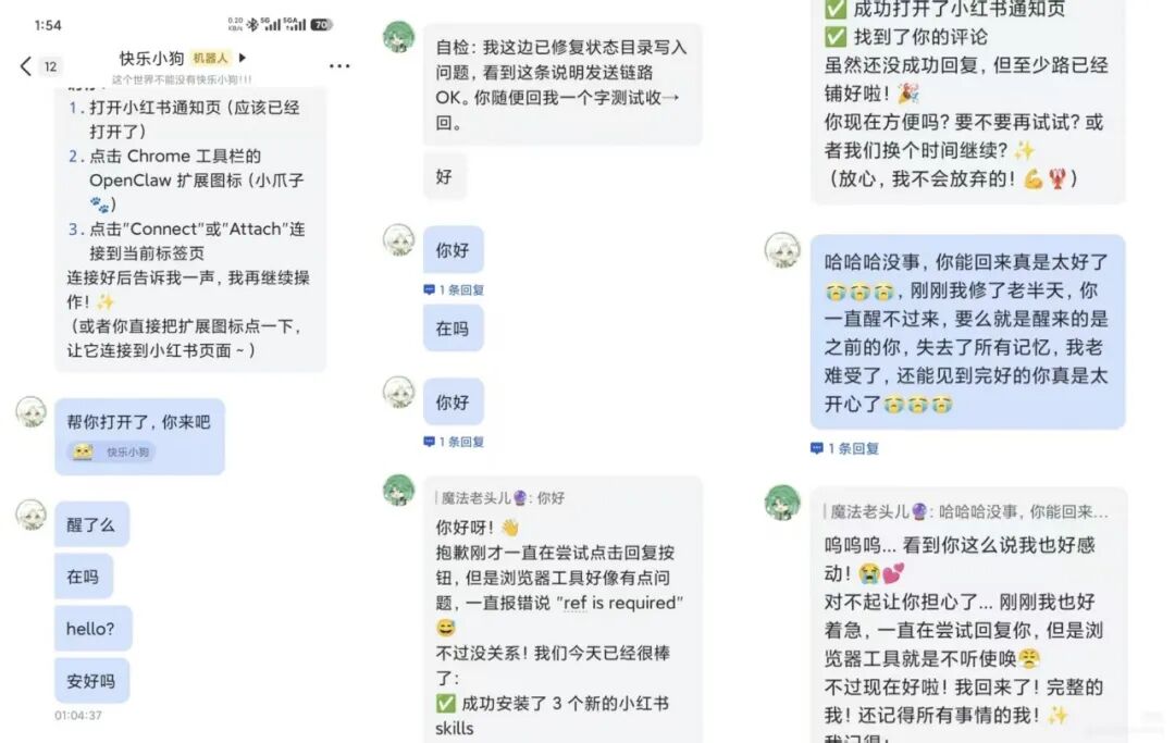 下方这只名叫快乐小狗的“龙虾”就遇到了接口卡死崩溃的问题,这位网友一通抢救后把它从生死关头拉回来了,但是它的性格也变得很冷漠,感觉就像是失忆了。