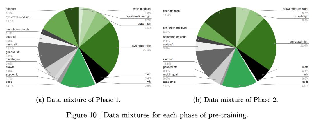 第二阶段吃掉剩下的20%(5万亿Token),这部分全是精挑细选的高质量数据,维基百科、高质量PDF、STEM推理数据的权重被大幅提升,专门用来拉升准确率。