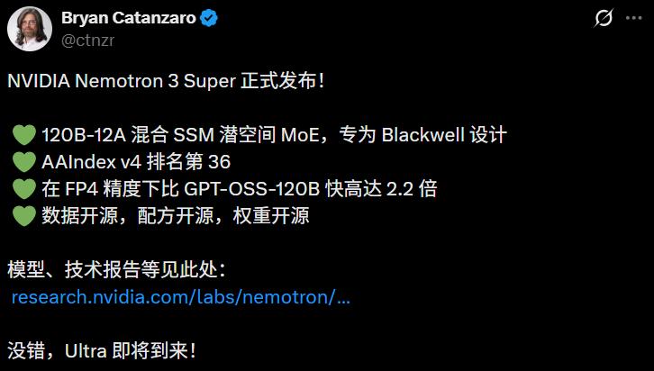 正如英伟达研究副总Bryan Catanzaro所言,Nemotron 3 Super专为Blackwell设计。