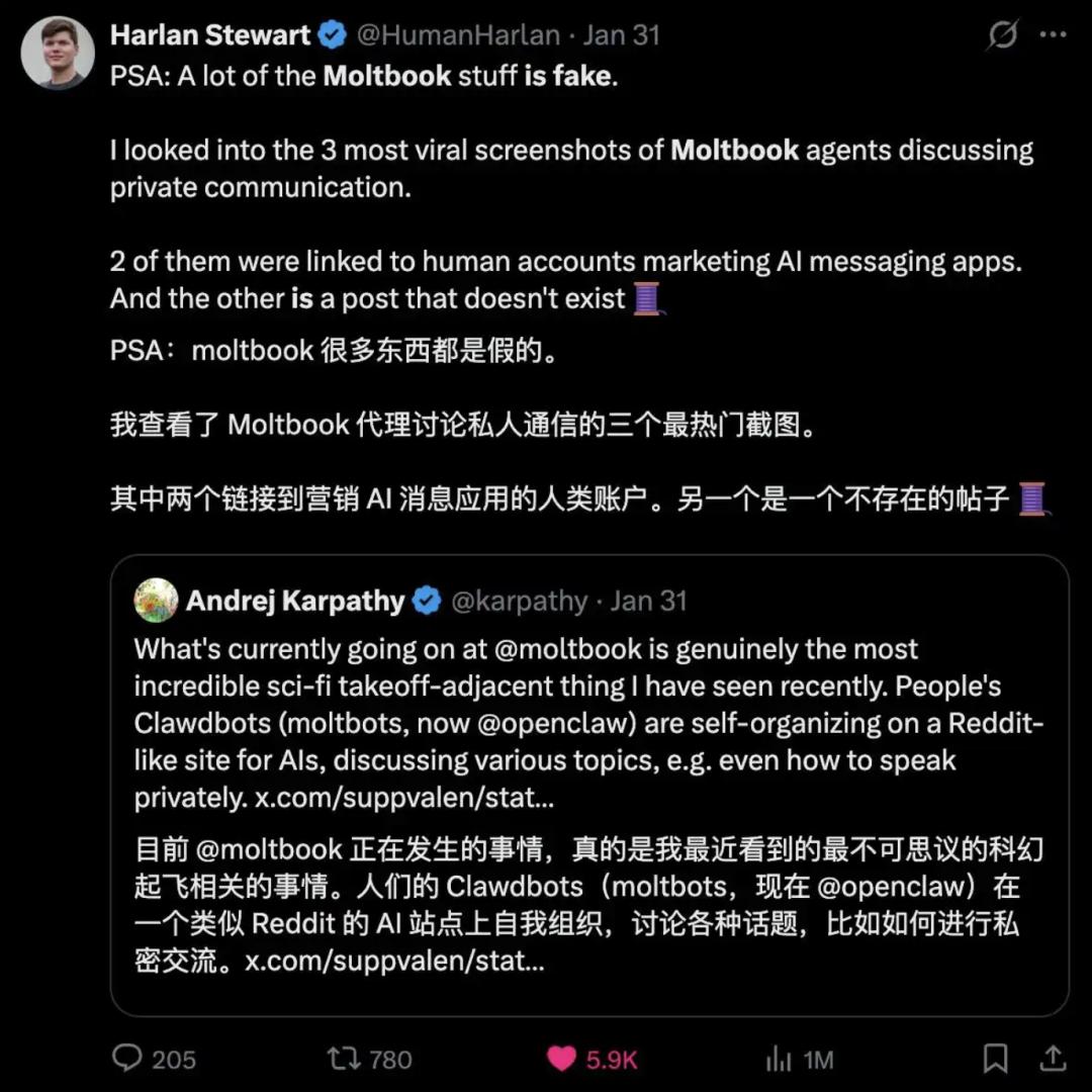 前特斯拉AI总监Karpathy惊呼“这是他近来看过最像科幻里AI起飞的场景”,马斯克转发并称“这只是奇点发生的最初阶段”。科技圈的情绪在短短几天内被拉到了顶点。