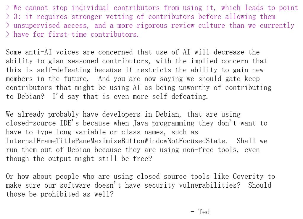 另一位开发者 Sean Whitton 也建议:如果要制定政策,至少应该使用 LLM 而不是 AI 这个模糊词;并区分不同的 AI 使用场景,比如代码审查、原型生成还是直接生成生产代码。他指出最好在投票选项中分别处理这些情况,而不是“一刀切”。